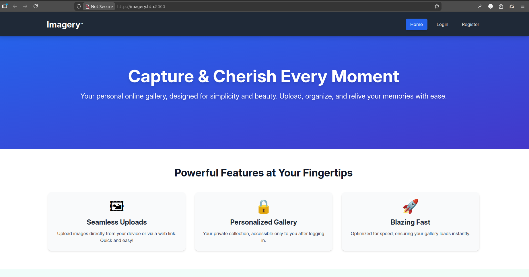 Al acceder a http://imagery.htb:8000, nos encontramos con una plataforma de gestión de imágenes. Para interactuar con las funciones internas de la aplicación, procedemos a crear una cuenta de usuario.