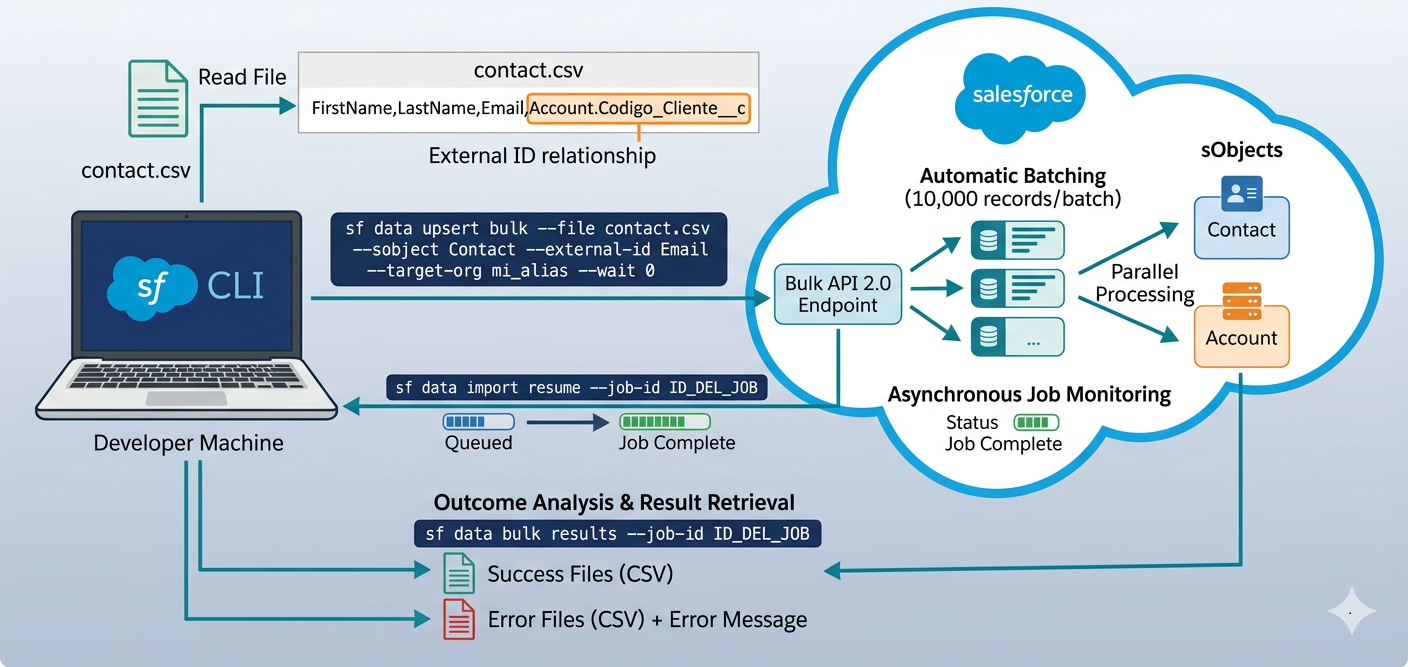 sf) gestiona de forma transparente el Access Token y la persistencia de la sesión mediante el alias de la organización. - Mecanismo de Ingesta: El cliente envía el archivo completo a un endpoint de carga; el servidor lo encola y procesa en paralelo según disponibilidad de recursos.