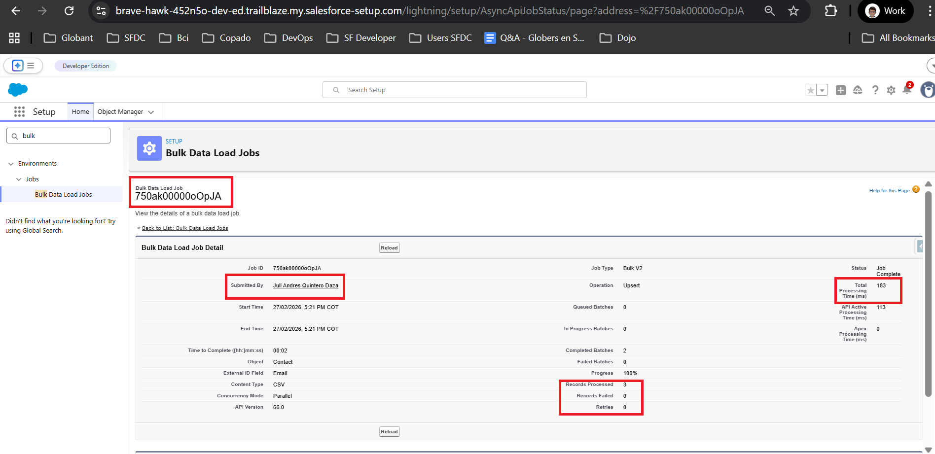 Una vez que el trabajo alcanza el estado JobComplete, procedemos con la auditoría de resultados para garantizar la integridad de los datos.