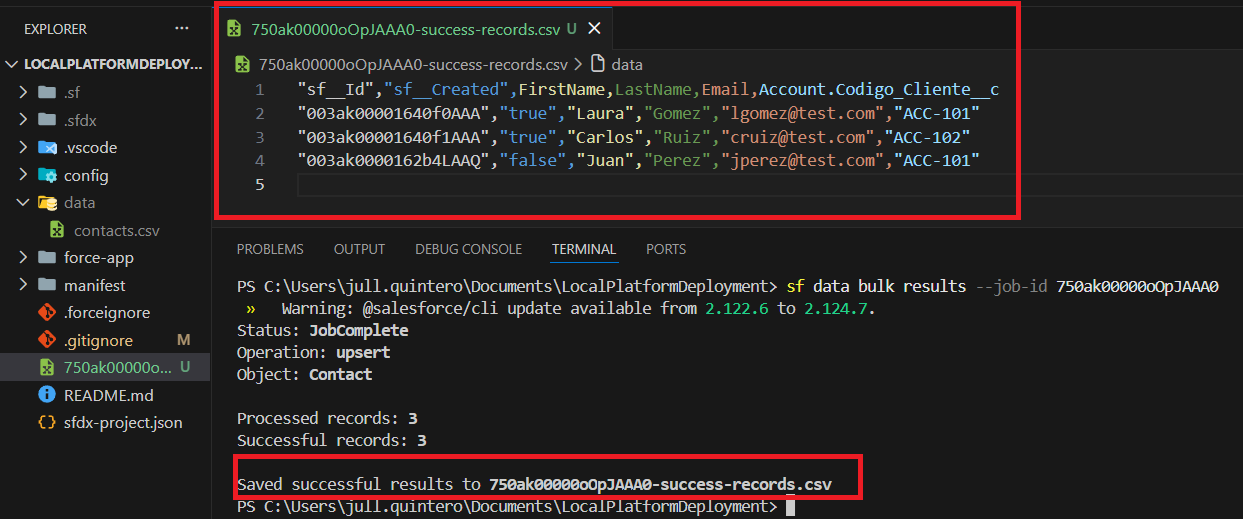 Este comando nos permite descargar localmente dos archivos CSV (success y failed) para un análisis detallado. El archivo de fallos incluye una columna adicional con el Error Message específico de Salesforce para cada registro.